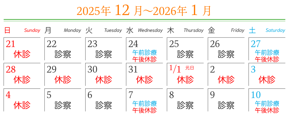 2025年12月28日(日)から2026年1月4日(日)まで年末年始の休診とさせていただきます。